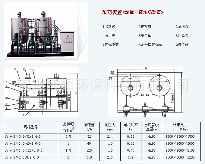 加藥裝置三種型號(hào),都有三大部分組成:1. 攪拌機(jī);2. 溶液槽;3. 計(jì)量裝置及投加設(shè)置。