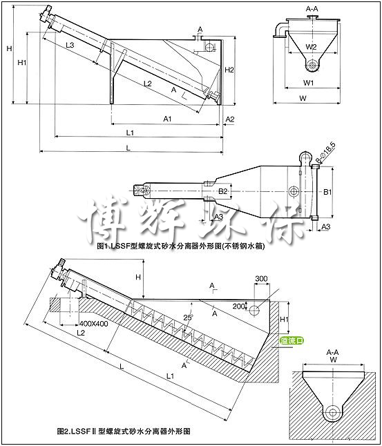 螺旋砂水分離器由驅(qū)動裝置、螺旋體、水箱、U形槽、襯條等部件組成。砂水分離機本體由砂水分離槽和螺旋輸砂槽組成。水槽的大分離流量和螺旋輸砂能力分離槽內(nèi)停留時間>2min,并具有足夠的余量。