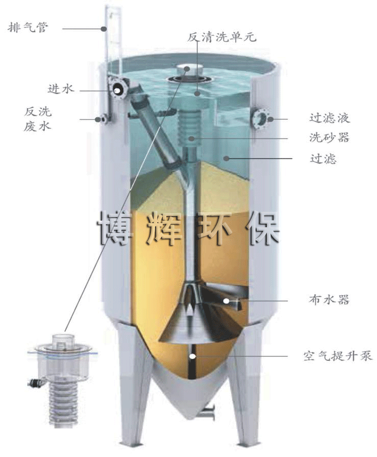 原水通過入水管進入活性砂過濾器中,經(jīng)布水器均勻分布后逆流向上通過濾床并由濾液排放口排出。底部截流有污染物的濾料由空氣提升泵提升至位于過濾器頂部的洗砂器,清洗后返回濾床上表面,進入下一個循環(huán),濾料清洗用水直接取自過濾器內(nèi)濾出液,不需專設(shè)清洗用水。